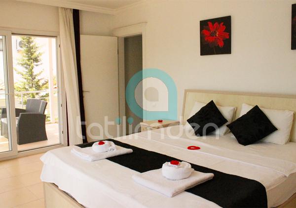 3. Yatak Odası : Süit aile odasıdır. 1 adet çift kişilik yatak, makyaj masası, klima, elbise dolabı, komodin, banyo/WC ve balkona çıkış bulunmaktadır.