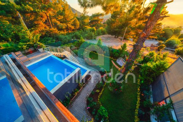 Bahçe : Bahçe içerisinde havuz, şezlong ve şemsiyeler, yemek masası ve sandalyeler, duş, bahçe oturma grubu ve hamak yer almaktadır.
