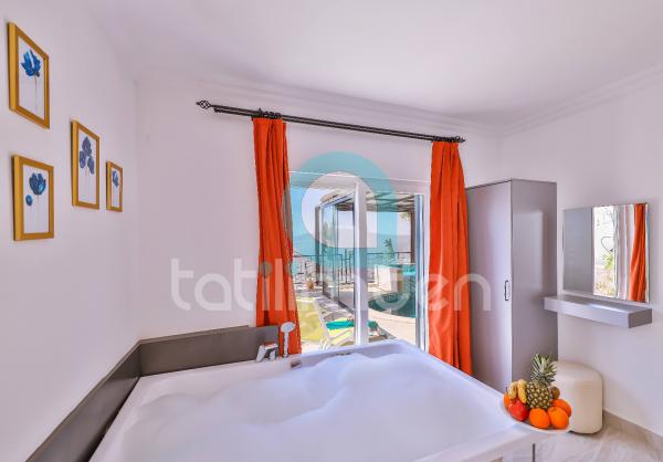 Kalkan Kördere bölgesinde bulunan bu kiralık villa, yatak odasında jakuzisi ile romantik anlar yaşamanızı sağlayarak dikkat çekmektedir. Balayı çiftleri için herşey en ince ayrıntısına kadar düşünülmüştür.