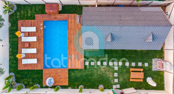 Bahçe : Özel yüzme havuzu, şezlong, güneş şemsiyesi, yemek masa, sandalyeleri ,salıncakk ve barbekü