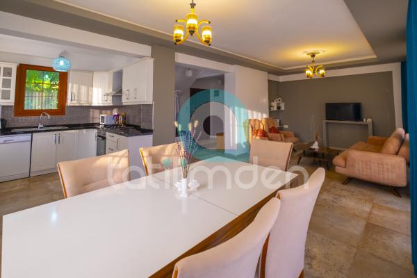 Salon : Oturma grubu, klima, LCD Tv, 5 kişilik yemek masası, ütü, ütü masası, uydu alıcısı, internet ve terasa çıkış bulunmaktadır
