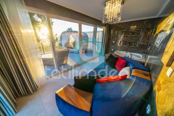 2-Yatak Odası : Klimalı, suit aile yatak odasıdır. 1 adet çift kişilik yatak, jakuzi, elbise dolabı, komodin, mini buz dolabı, fransız balkon, şık dinlenme koltuğu,çamaşır makinesi, banyo/ WC ve verandaya çıkış,veranda
