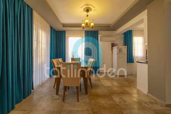 Salon : Oturma grubu, klima, LCD Tv, 5 kişilik yemek masası, ütü, ütü masası, uydu alıcısı, internet ve terasa çıkış bulunmaktadır